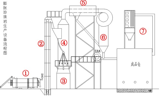 原砂—預(yù)熱爐—斗式提升機(jī)—珍珠巖膨脹爐—水冷系統(tǒng)—蝸牛式分離器—風(fēng)送系統(tǒng)—稱量包裝—除塵系統(tǒng)