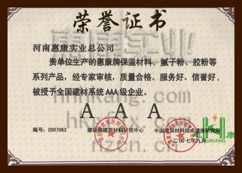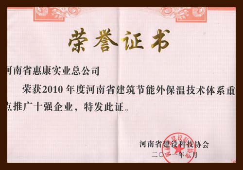 河南省惠康實業(yè)總公司榮獲2010年度河南省建筑節(jié)能外保溫技術(shù)體系重點推廣十強企業(yè)。